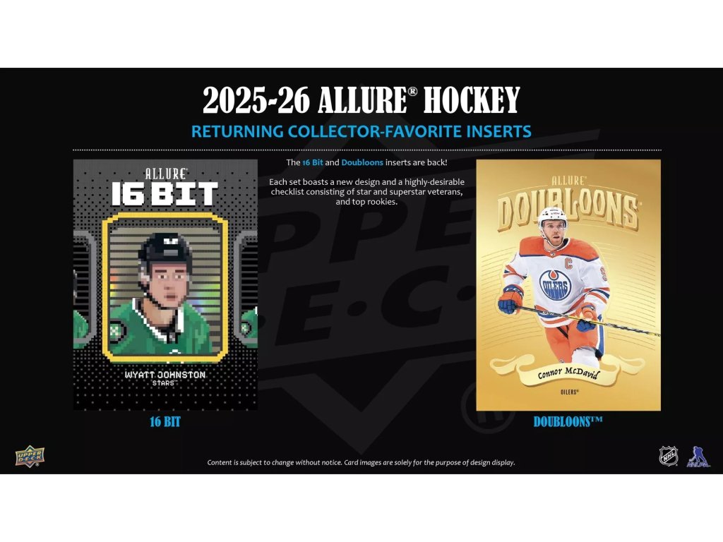 Hobby balíček Upper Deck Allure 2025-26 obsahuje 8 hokejových karet NHL s moderním a lesklým designem.